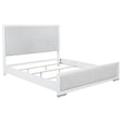 This panel bed pairs crisp framing with soft textures for a look that feels both refined and restful. The panel-style headboard and footboard are upholstered in light fabric with subtle herringbone texture, bordered by a clean white frame and finished with brushed nickel feet. Crafted from solid rubberwood, engineered wood, and foam padding, it offers visual contrast and supportive comfort. Foundation required.