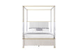 The Malmo Queen Canopy Bed is a stunning statement of modern luxury. Framed in a light beige oak veneer, it features acrylic posts accented with gold trim for a glamorous touch. The beige textured upholstered headboard adds softness and elegance, while matching gold accents on the canopy, headboard, and footboard complete the upscale look. With a fully slatted design for reliable support, this canopy bed is as functional as it is beautiful.