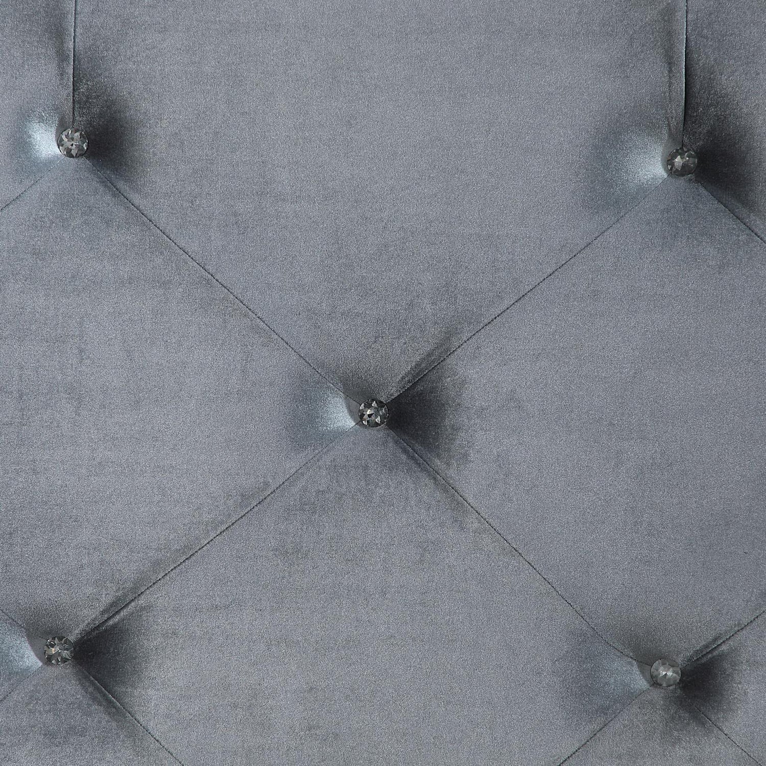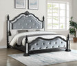 Gloss Finish, Luxurious Velvet Headboard & Footboard, Button Tufting, Poster Bed Styling, Mirror Accents, Ornate Design Drawer Fronts, Twisted Bun Feet, Chrome Drawer Handles