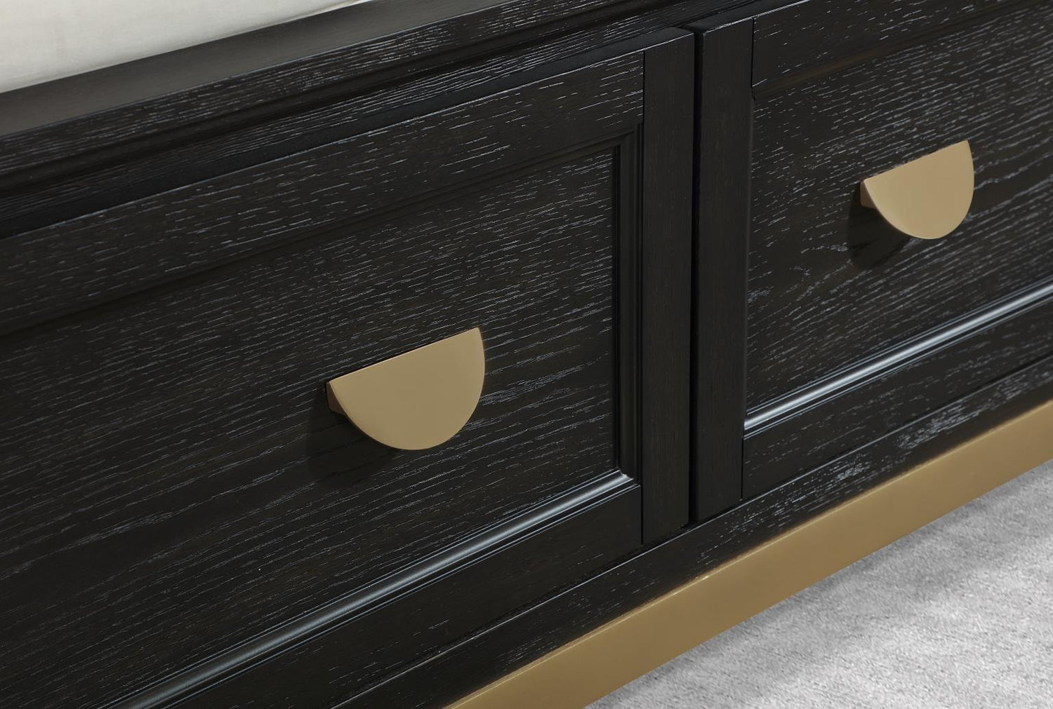Ebony Finish, Panel Headboard and Storage Footboard, Vertical Accent Pattern for Headboard, Low Profile Footboard, 100% Solid Wood Construction, Brushed Stainless Steel Case Hardware, Felt Lined Top Drawers