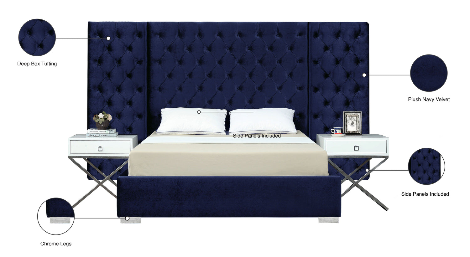 Rejuvenate your bedroom space with this Grande Bed. Svelte velvet covers each inch of this magnificently styled bed, lending it a bit of softness and glamour. The bold headboard is heavily button tufted for a regal and sophisticated look, and it's padded, so you can rest your back against it while you read or watch TV. The full-framed base is modish and sleek and provides sturdy support for the mattress of your choice.