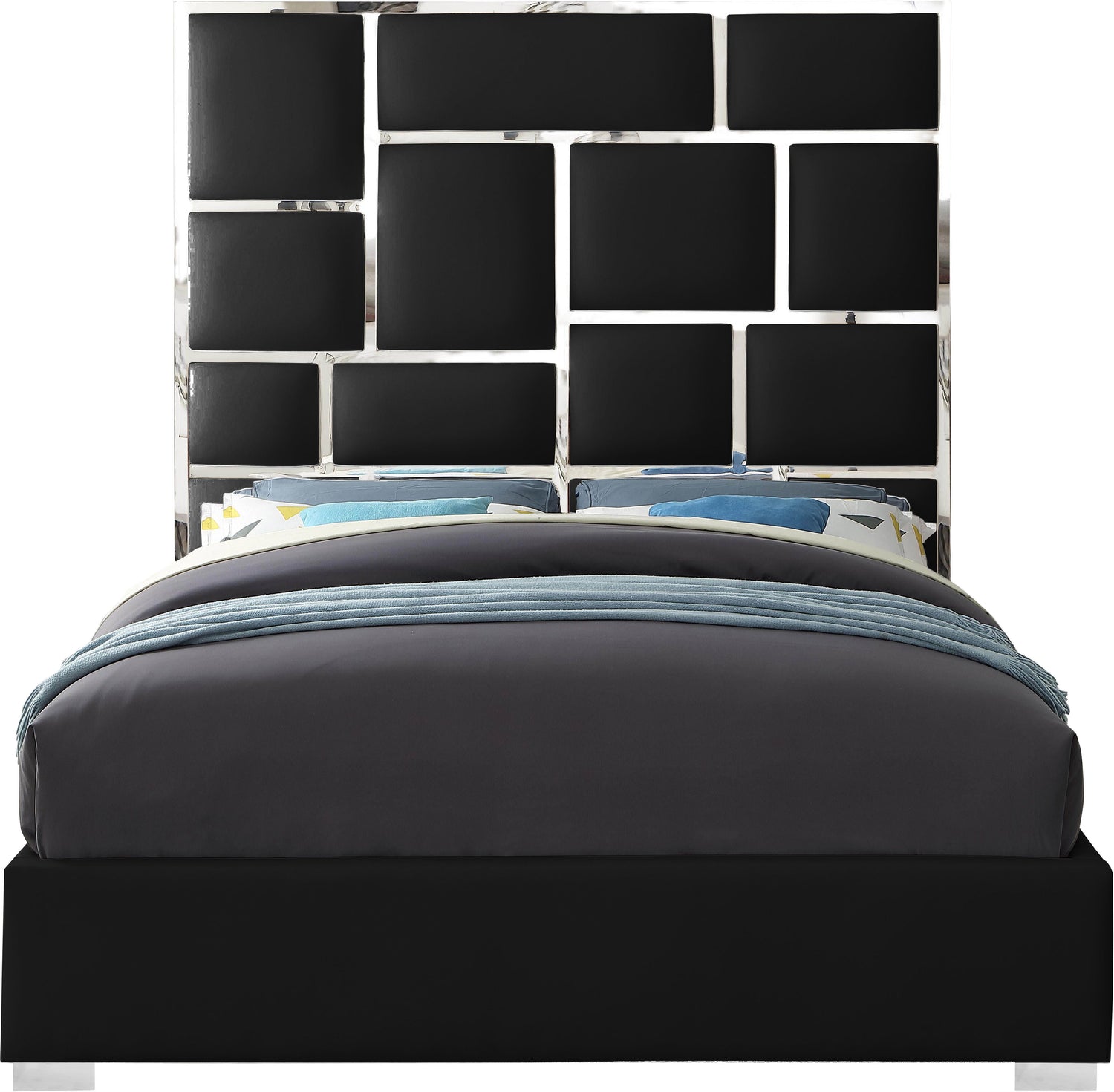 Make this Milan faux leather bed the center showpiece in your bedroom makeover. This elegant bed has a bold look with its super-tall headboard that's divided up into subway blocks for a slightly industrial feel.d metal against the soft and durable faux leather adds a stunning feel to this bed. Additional leather wraps its way all around the sides of the bed for a finished and tailored presentation that turns heads and makes your bed the star of the show.