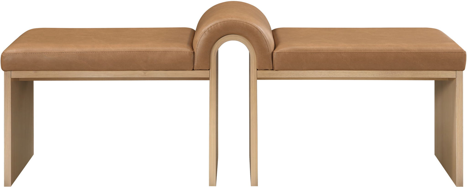 Seamlessly blending modern elegance with timeless craftsmanship, the Delphine vegan leather upholstered bench has a unique curvature to uplift any space. Upholstered in soft vegan leather, this bench offers a sleek, refined look complemented by its natural finish and oak veneer base. Crafted from a mix of solid wood and MDF, its contemporary design provides both durability and style, making it a versatile statement piece.