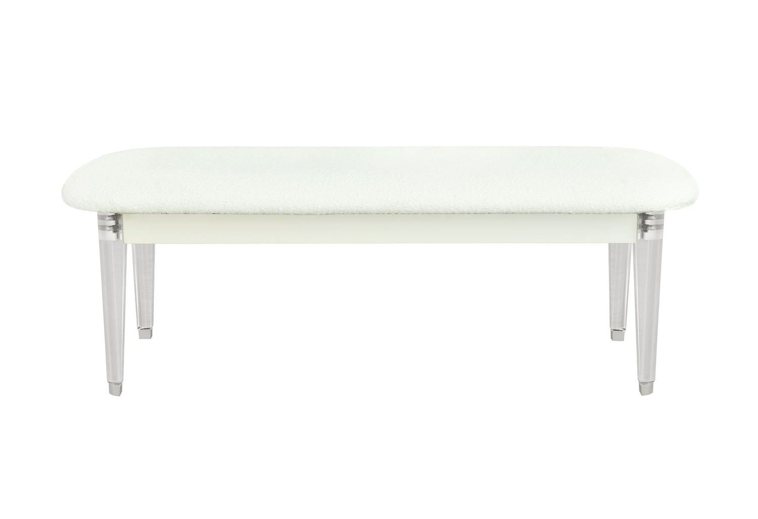 The Lyra Bench brings both comfort and sophistication to the Lyra Bedroom Collection. Upholstered in the same soft white fabric as the bed's headboard, it ties the look of the room together with seamless elegance. Its sleek acrylic legs add a touch of modern glamour, while the generously padded seat provides the perfect spot for dressing, relaxing, or adding a luxurious accent at the foot of the bed. Stylish and versatile, the Lyra Bench is a refined finishing touch to your bedroom retreat.