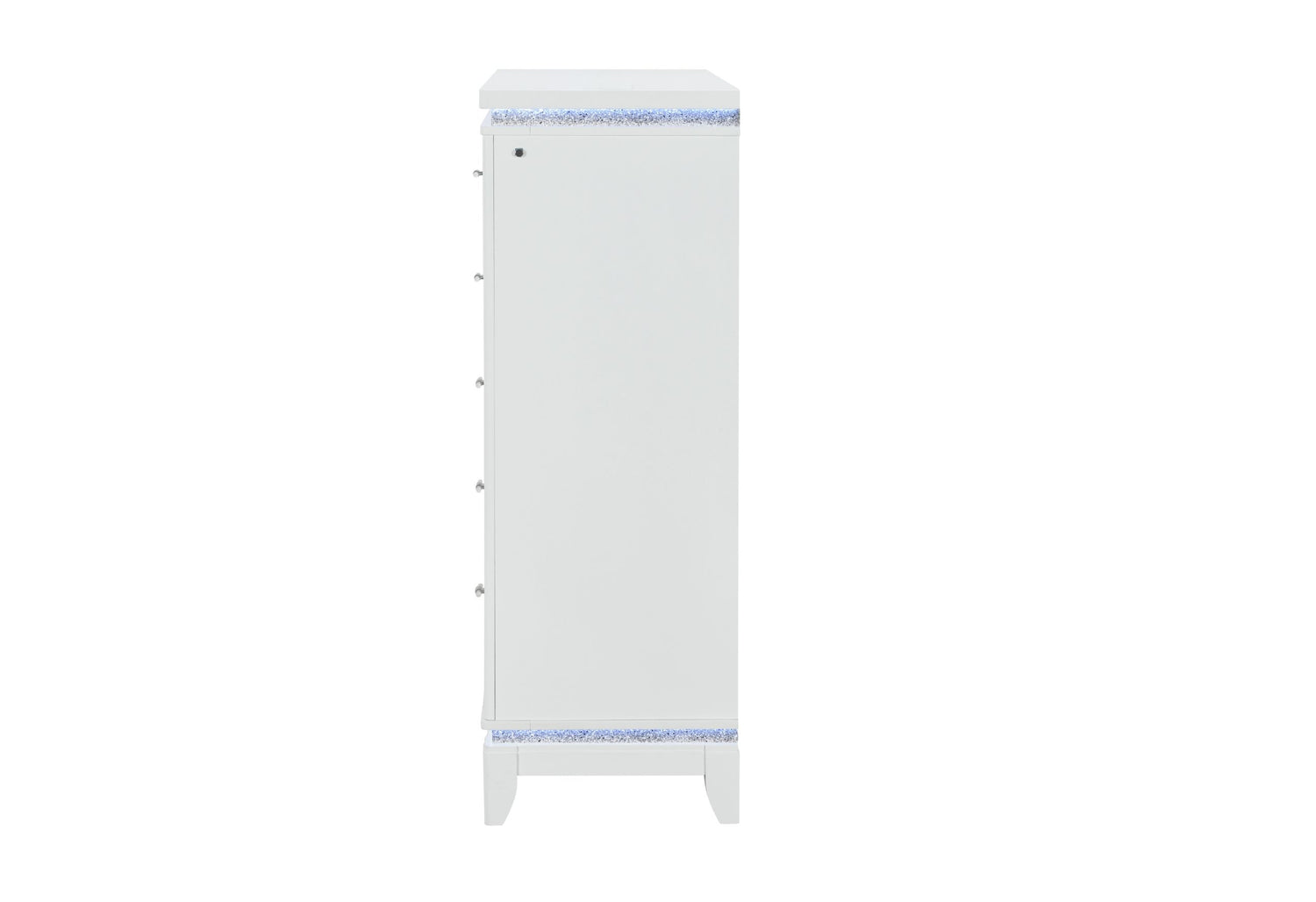 Maximize your bedroom's storage and style with the Alina Chest. Standing tall, this piece features the signature crushed glitter and LED accents, along with the perforated silver glam fronts that add a touch of sparkle. Five generously sized drawers glide smoothly, making organization an effortless and elegant affair.