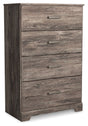 With its clean-lined look and modern attitude, this chest of drawers is a fresh style awakening. A warm gray hue over replicated oak grain easily complements other furniture finishes. Smooth drawer fronts with antiqued pewter-tone handles complete the aesthetic.