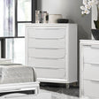 The Tarian chest will add stylish glamour with a refined touch of glitz to your bedroom! Sturdily crafted for long-term use, this bed is finished in a fresh and alluring pearl white. This piece offers five deep storage drawers to help keep your space organized and tidy. Mirrored-finished trim and elongated drawer pulls on the drawer fronts add captivating pizzazz. It stands on sturdy clear acrylic legs that make the bed appear as if it is floating.