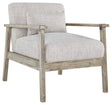 Keep your seating casually cool with this accent chair. The clean-lined design sports a gray finish for a modern appeal, while light neutral upholstery in a herringbone pattern creates textural interest. Antiqued pewter-tone accents add a touch of urban flair, rounding out this relaxed take on contemporary style.