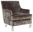 This accent chair with shelter arm styling merges contemporary and traditional styling in the most beautiful way. The combination of polyester crushed velvet upholstery and tapered clear acrylic legs makes for one cool contrast. Combining comfort and fashion-forward design for the modern enthusiast.