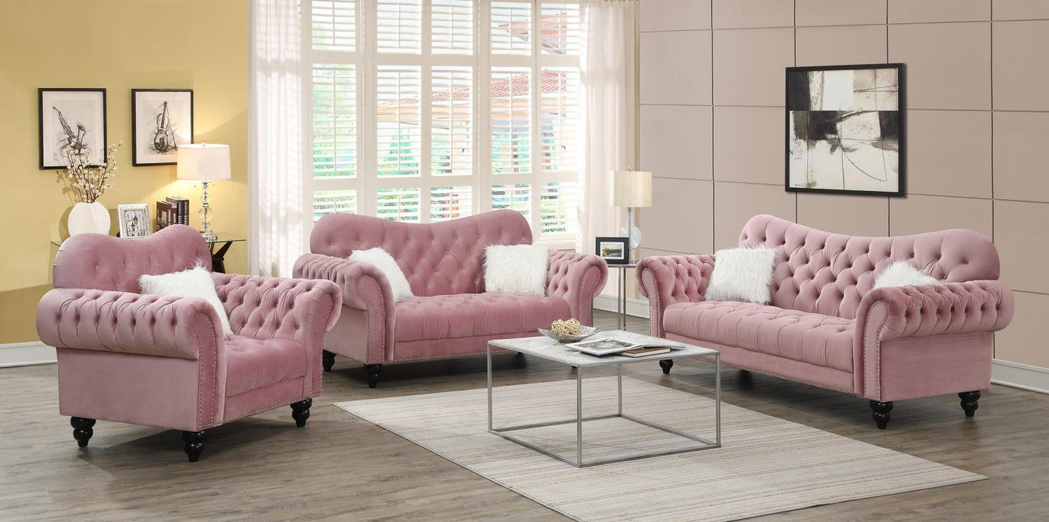 Tufted Seat, Back, and Arms, Pink Luxurious Velvet, & Rolled Arms, One Solid Cushion Seating, & Wavy Back Design, Chrome Nail Head Trim Accents, Solid Wood Leg, & Faux Fur Accent Pillows, Removable Backs and Arms for Easy Delivery, Tufted Seat and Back, & Pink Luxurious Velve, One Solid Chaise Cushion, Chrome Nail Head Trim Accents, Ebony Black Bun Feet, Faux Fur Accent Pillows, Solid Wood Leg