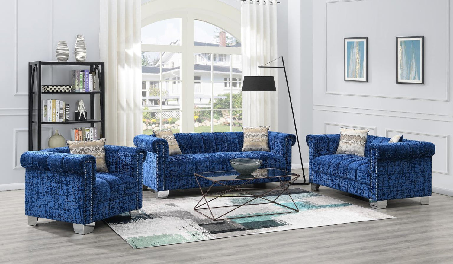 Crushed Velvet Blue Fabric, Vertical Accents, Squared Arms and Back, Single Seat Cushion, High Density Foam Cushion, Chrome Feet