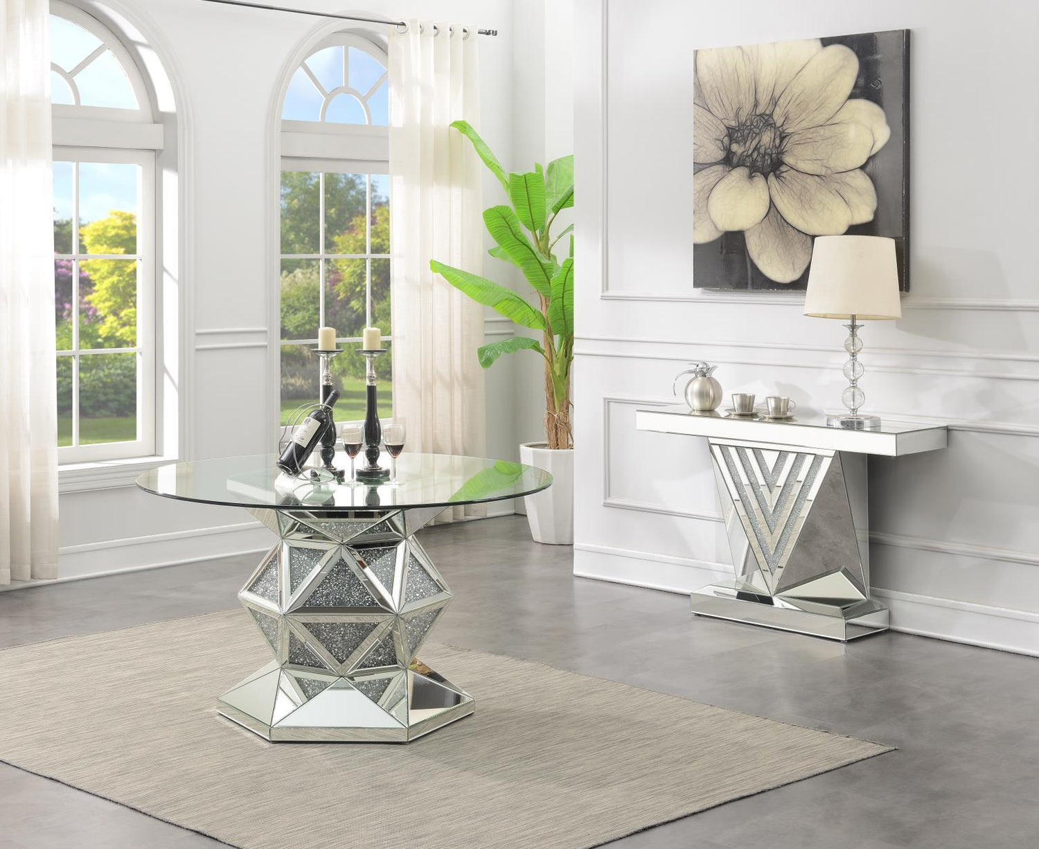 10mm Tempered Clear Glass Top & 8mm Mirror Overlaying MDF and Particle Board, Crushed Glass Inserts & Triangular Shape Accents, Octagon Shaped Base & Beveled Edges, Glamour Style Design & Seat Cushion and Back, Rolled Back & Chrome Chair Frame, Elegant Style Chair Legs & Capability to Fit up to 4 Chairs