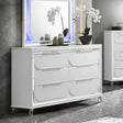 The Tarian dresser will add stylish glamour with a refined touch of glitz to your bedroom! Sturdily crafted for long-term use, this bed is finished in a fresh and alluring pearl white. This piece offers six deep storage drawers to help keep your space organized and tidy. Mirrored-finished trim and elongated drawer pulls on the drawer fronts add captivating pizzazz. It stands on sturdy clear acrylic legs that make the bed appear as if it is floating. Mirror sold separately.