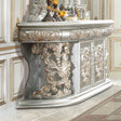 A luxurious antique silver finish with hand-brushed gold accents makes up the Sandoval dresser. Surrounded by fine Rococo scrolls and floral ornament crowns with stylized ribbons. Featuring three convenient storage drawers and two-door storage compartments. The base has an intricate open design for a modern appeal. The spacious table top has enough room for displaying jewelry and perfumes.