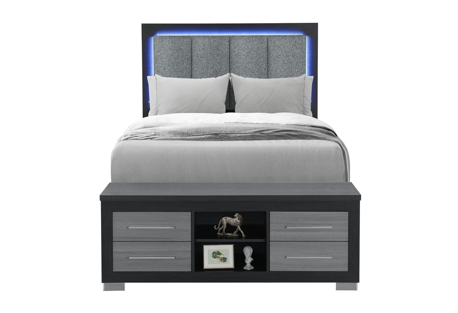 The Emma Full Bed is the centerpiece of this stunning collection, blending modern elegance with unparalleled functionality. The padded grey upholstered headboard features an LED light and USB ports for added convenience, perfect for reading or charging devices. With its ingenious all-around storage design which provides ample space for bedding, clothing, and more. The two-tone black and grey finish completes the contemporary look, making this bed a true standout in any bedroom.
