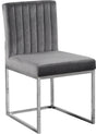 Take dining to a posh new level with this Giselle Dining Chair. A boxy design makes it a nice addition to contemporary spaces, and it's armless design makes it easy to get into and out of with ease. The seat and back are upholstered in rich velvet for a lavish vibe and a pop of sumptuous color to liven up your room, and both are padded well to make sure diners stay comfy while they enjoy their meal. The metal frame is finished in silver for added beauty and aesthetic appeal.