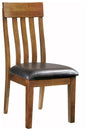 Comfortably contoured with a rake back design, this dining room side chair beautifully captures the essence of rustic refinement. Its plushly upholstered faux leather seat makes pulling up a chair so much more enticing. Makes for easy cleanup, too.