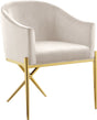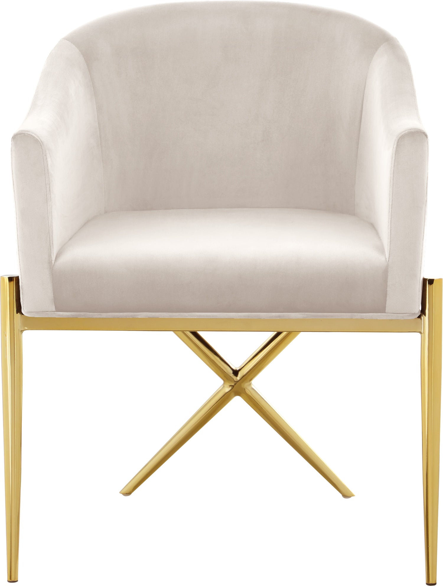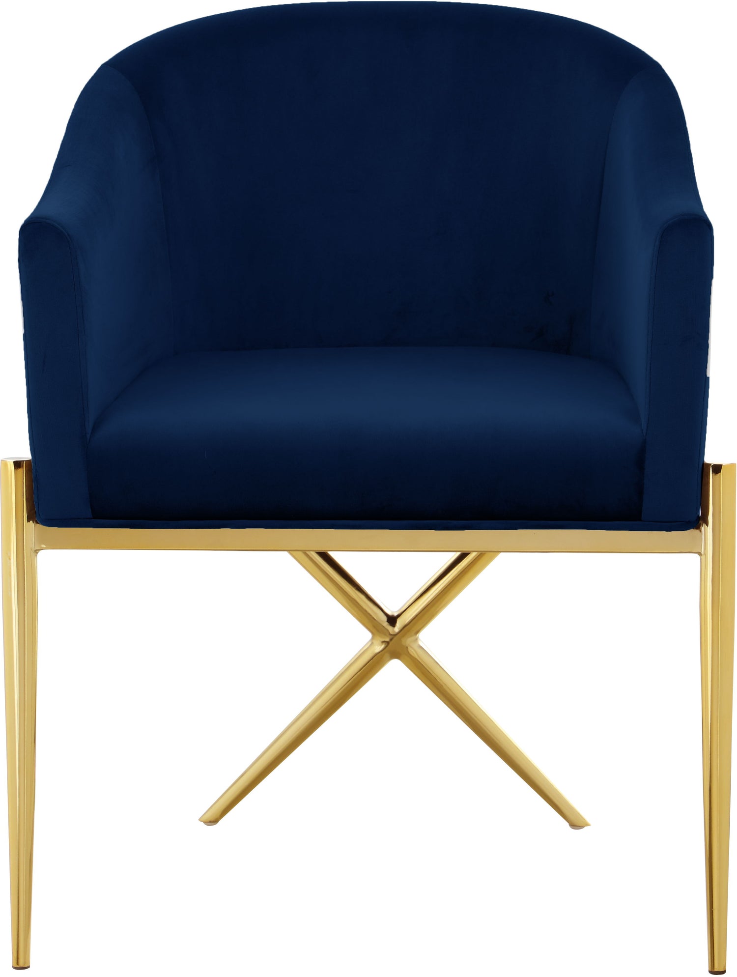 Spread elegance and modernity to your dining room with this Xavier velvet dining chair from Meridian Furniture. This beautiful chair features a simple barrel seat with a plush cushion and back, ensuring that every meal is a comfortable one. The steel legs provide durable support while you sit, and an "X" leg in the back lends the chair an uber-modern vibe. finishing on the base is sleek and chic, giving this chair a contemporary edge that's well at home in any modern dining room. Sleek velvet upholstery is durable and tough yet soft against your body, elevating meal times to a luxurious experience.