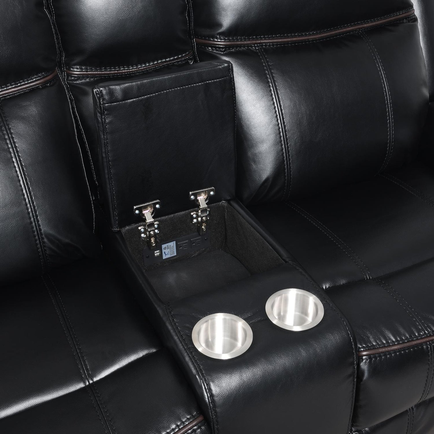 Gel Leather, & Manual Motion Recliners, Pillow Top Arms and Headrest, & Cup Holder Console with Storage, Sinuous Spring Support System, Reenforced Steel Reclining Mechanism, Power Outlets, & USB Ports, Drop Down Cup Holder, & Hidden Storage Compartment in Sofa, Gel Leather, Manual Motion Recliner, Pillow Top Arms and Headrest, Sinuous Spring Support System, Reenforced Steel Recliner Mechanism, Backs Detach for Easy Delivery
