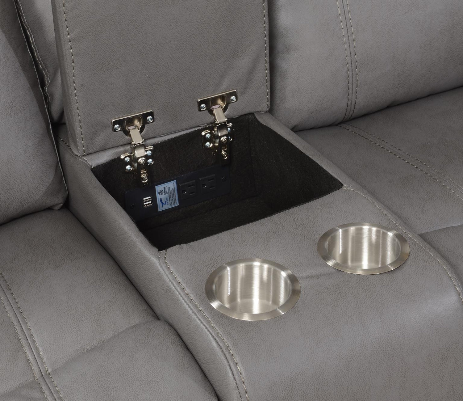 Gel Leather, & Manual Motion Recliners, Pillow Top Arms and Headrest, & Cup Holder Console with Storage, Sinuous Spring Support System, Reenforced Steel Reclining Mechanism, Power Outlets, & USB Ports, Drop Down Cup Holder, & Hidden Storage Compartment in Sofa, Gel Leather, Manual Motion Recliner, Pillow Top Arms and Headrest, Sinuous Spring Support System, Reenforced Steel Recliner Mechanism, Backs Detach for Easy Delivery