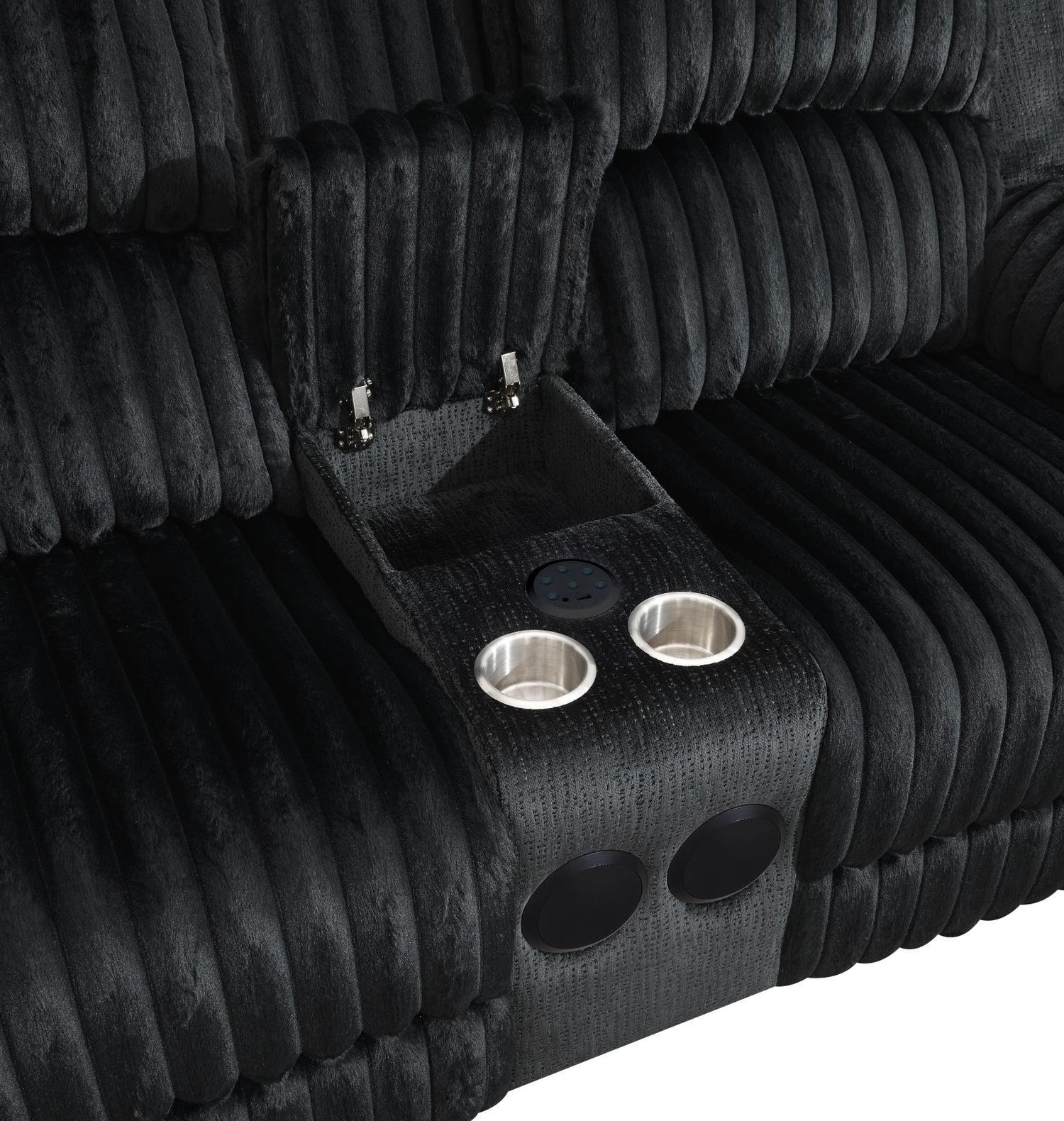 Corduroy Fabric, Pillowtop Arms and Headrest, LED Underglow Accents, Stainless Steel Cup Holders, Drop Down Table, USB and Type C Ports, Wireless Charging, Power Reclining