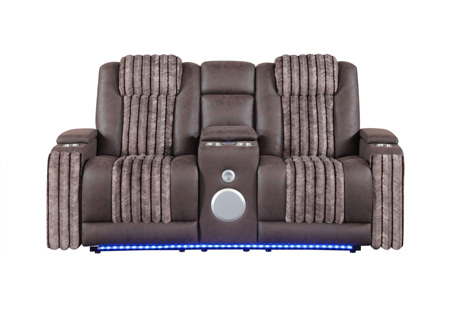 The U8000 Brown Console Reclining Loveseat pairs cutting-edge design with plush comfort. Finished in brown upholstery with soft corduroy faux fur accents, it features dual power recliners, built-in LED lighting, and convenient cupholders. The center console provides ample storage and includes a Bluetooth speaker, delivering immersive sound for your favorite music or movies. A showpiece of comfort and style.