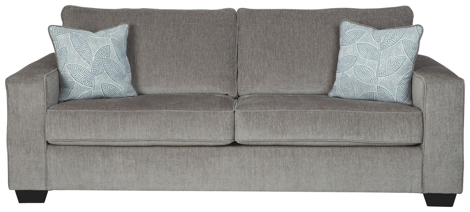 If style is the question, then this sofa sleeper is the answer. Sporting clean lines and sleek track arms, the decidedly contemporary profile is enhanced with plump cushioning and a chenille-feel upholstery, so pleasing to the touch. Sure to play well with so many color schemes, this sofa sleeper in slate gray includes a pair of understated floral pattern pillows for fashionably fresh appeal. Pull-out queen mattress in quality memory foam comfortably accommodates overnight guests.