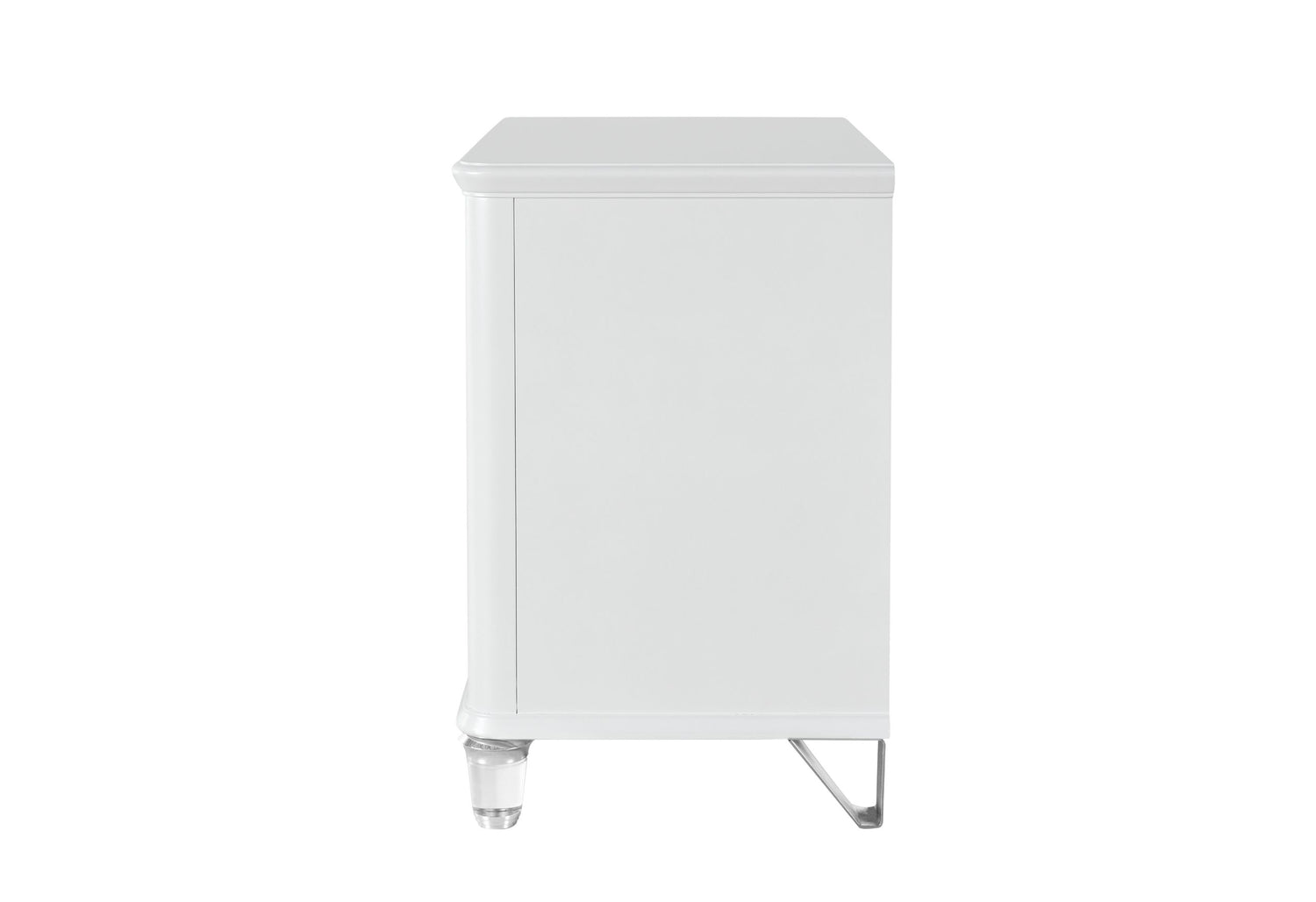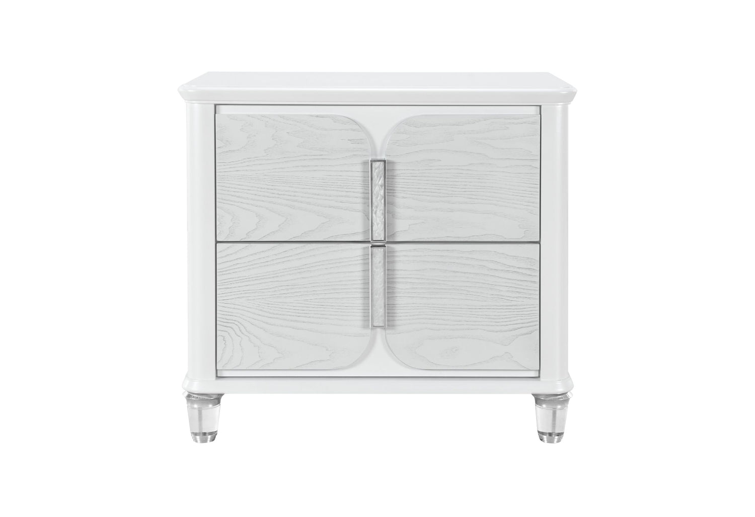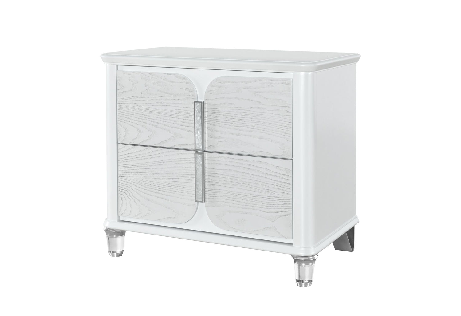 The Apollo Nightstand offers convenience and style, with textured drawer fronts and acrylic legs. Perfect for keeping essentials close at hand, it complements the collection beautifully.