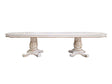 Commanding attention in any space, the impressive design of the Vendom double pedestal dining table will impress everyone. Adorned with classic elements including scrolls, curved shapes, and leaf molding accents to create an old-world charm. The antique pearl finish is accentuated with hand-brushed gold to make the molding details stand out.