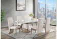 Introducing the D12 Dining Set by Global Furniture, a stunning and contemporary addition to your dining space. This exquisite set combines elegance and durability, perfect for both casual family meals and sophisticated dinner parties. The focal point of this set is the table, featuring a faux marble top that exudes timeless luxury. Its sleek natural wood tone base with faux marble accents adds a touch of modernity and complements any interior décor effortlessly. Crafted with meticulous attention to detail, the D12 table offers a sturdy construction that ensures years of reliable use. The accompanying chairs are designed to provide both comfort and style. The chairs' standout feature is the Chanel tufting on their backs, which adds a touch of sophistication and creates an eye-catching focal point. Whether you're hosting a formal dinner or enjoying a casual family gathering, the D12 Dining Set by Global Furniture is the epitome of refined taste. Elevate your dining area with this exquisite ensemble that seamlessly combines modern aesthetics, durability, and comfort.