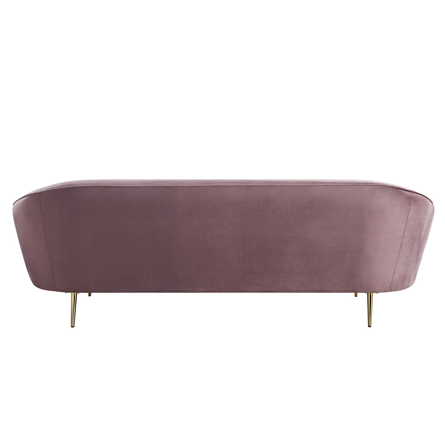The Abey living room collection is not only visually striking, but it also offers plenty of comfort. The curved silhouette creates a glam appearance. Upholstered in a luxurious pink velvet fabric to add dimension to the pieces. The gold metal tapered legs add another pop color and emphasize the glamorous design. This set provides enough seating for all your guests.