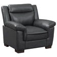 Bring modern comfort and sophistication to your seating area with this contemporary armchair. Upholstered in smooth grey leatherette with detailed stitching, it offers a clean, refined look. Generously padded seating and plush pillow-top arms provide exceptional comfort, while the high back delivers excellent support. Its sturdy wooden frame and dark brown block-style legs add lasting stability and a touch of contrast. Compact and stylish, this chair enhances any living room or lounge space with its modern design and inviting appeal.