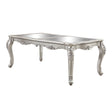 An ode to traditional glamour, the Devayne dining table brings in all the allure and charm that you are seeking for a dining table. The table features an extension leaf that allows for additional dinner guests. The champagne finish enhances the beautiful floral moldings on the legs and apron. The tabletop features mirrored panels that highlight your dinnerware.