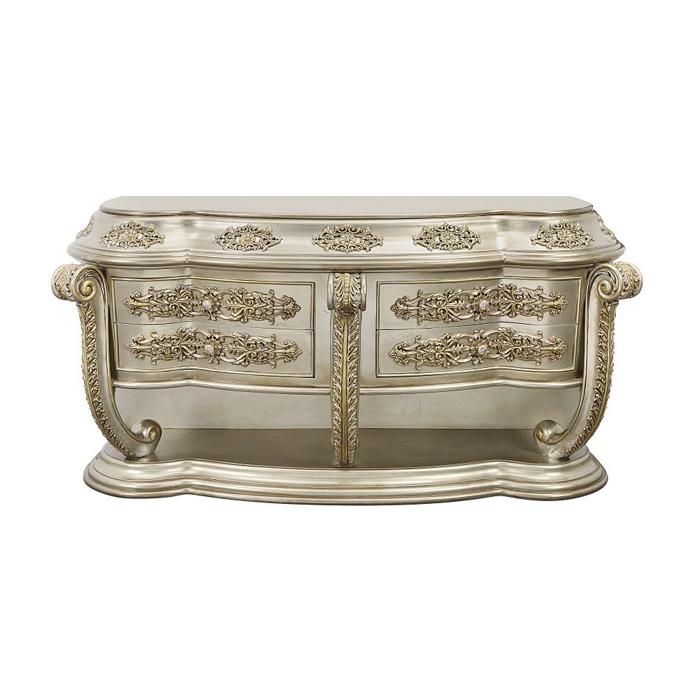 Bigger is always better, the Danae dining table is a true testament to that. Boasting immaculate details on the base and legs that are fit for royalty. This grand piece is sure to leave a lasting impression on everyone that feasts their eyes on it. The Champagne and gold accents help enhance the ornamental details.