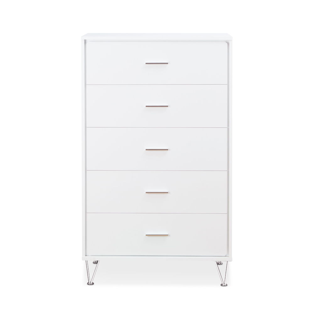 This beautiful Deoss chest of drawers boasts of contemporary style, five drawers with metal drawer handles. Crafted with multi shades of wood, the raw wood texture enhances this dresser's sleek style and the drawers provide plenty of storage space for clothes and more.