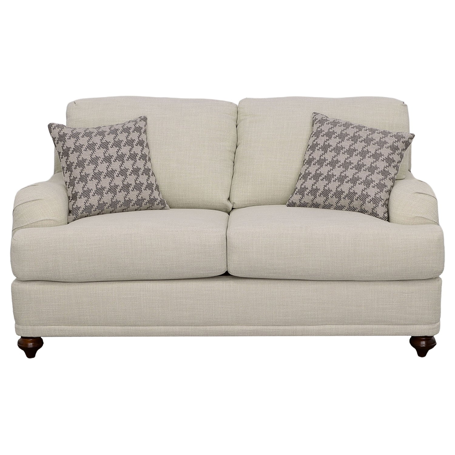 Give your living room or den a charming presence where friends and family feel at ease. This two-tone modern farmhouse loveseat helps confirm that everyone is always welcome. It features light grey linen-like reversible seat cushions, which help extend the life of your upholstery, and contoured armrests that are comfortable as they are alluring. The loveseat also boasts exquisite bun legs in a deep contrasting espresso finish. Accent pillows in complementary tones and patterns tie the entire design together.